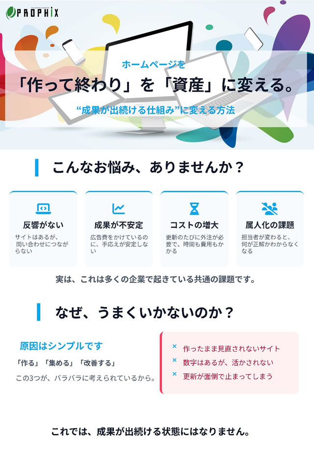 多くの企業では、ホームページを制作しても更新が止まり、問い合わせにつながらないという課題があります。プロフィックスでは、サイト制作から分析、運用改善までを一括で支援します。アクセスデータをもとに継続的な改善を行い、企業の強みを伝えながら成果につながるWebサイトを育てていきます。