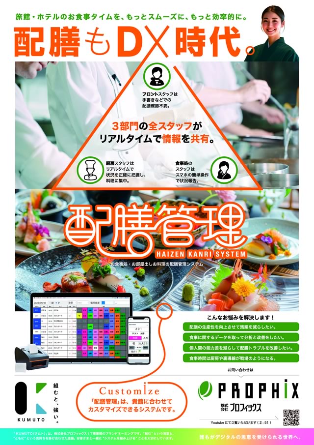 配膳管理システムは、旅館・ホテルの食事提供を効率化するDXソリューションです。フロント、厨房、配膳スタッフがリアルタイムで配膳情報を共有できるため、配膳ミスの削減や業務効率の向上を実現します。宿泊施設のオペレーション改善とサービス品質向上を支援します。